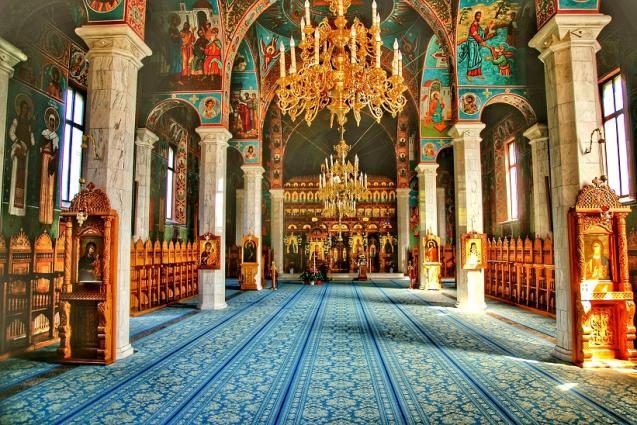 Intrarea în biserică se face prin partea de vest. Deasupra intrării se află şapte firide, împodobite cu icoane realizate în mozaic de aceiaşi pictori. Nartexul este prevăzut cu trei calote pe tavan şi sprijinit pe zece coloane cu capiteluri, îmbrăcate în marmură, dintre care două sunt angajate în zid. Accesul în pridvorul bisericii se face printr-o uşă masivă metalică, cu ornamente de bronz încastrate. Pridvorul este încadrat de două turnuri, deasupra lui fiind cafasul. Pronaosul are trei nave, una centrală şi două laterale, mai înguste. Nava centrală este prevăzută cu trei calote sferice, fiecare fiind înconjurată de o suprafaţă orizontală şi susţinută de câte patru pandantivi, sprijiniţi pe coloane. Pe navele mici, pe fiecare din pereţii laterali, în partea de sus, se formează trei arcade şi timpanele respective, iar sub fiecare arcadă se află câte o fereastră. Naosul este sprijinit pe patru coloane, din care două sunt angajate în peretele altarului. Turla Pantocrator, de formă cilindrică, are la bază patru timpane, despărţite prin patru pandantivi, iar în partea de sus se află patru ferestre. Cele două abside ale naosului sunt prevăzute cu două firide alungite spre altar și au câte o fereastră.