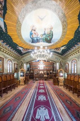 Naosul, pictat în întregime între anii 1949‑1951, prezintă douăsprezece scene biblice şi zece icoane murale de o înaltă ţinută artistică. În absidele laterale sunt pictaţi, în primul registru, sfinţii melozi, cei dintâi compozitori de cântări bisericeşti: Sfântul Ioan Damaschin, Sfântul Ioan Cucuzel, Sfântul Roman Melodul ş.a. Registrul următor cuprinde patru scene din viaţa Mântuitorului Iisus Hristos: Intrarea în Ierusalim, Învierea lui Lazăr, Înălţarea la cer şi Pogorârea Duhului Sfânt.