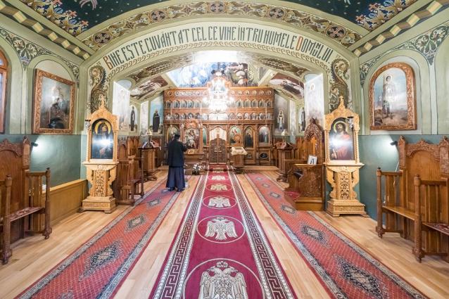Naosul, pictat în întregime între anii 1949‑1951, prezintă douăsprezece scene biblice şi zece icoane murale de o înaltă ţinută artistică. În absidele laterale sunt pictaţi, în primul registru, sfinţii melozi, cei dintâi compozitori de cântări bisericeşti: Sfântul Ioan Damaschin, Sfântul Ioan Cucuzel, Sfântul Roman Melodul ş.a. Registrul următor cuprinde patru scene din viaţa Mântuitorului Iisus Hristos: Intrarea în Ierusalim, Învierea lui Lazăr, Înălţarea la cer şi Pogorârea Duhului Sfânt.